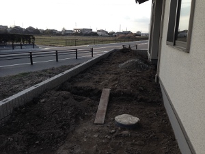 ガーデンのタイルテラス。道路からの目隠しを兼ねた高木の列植。